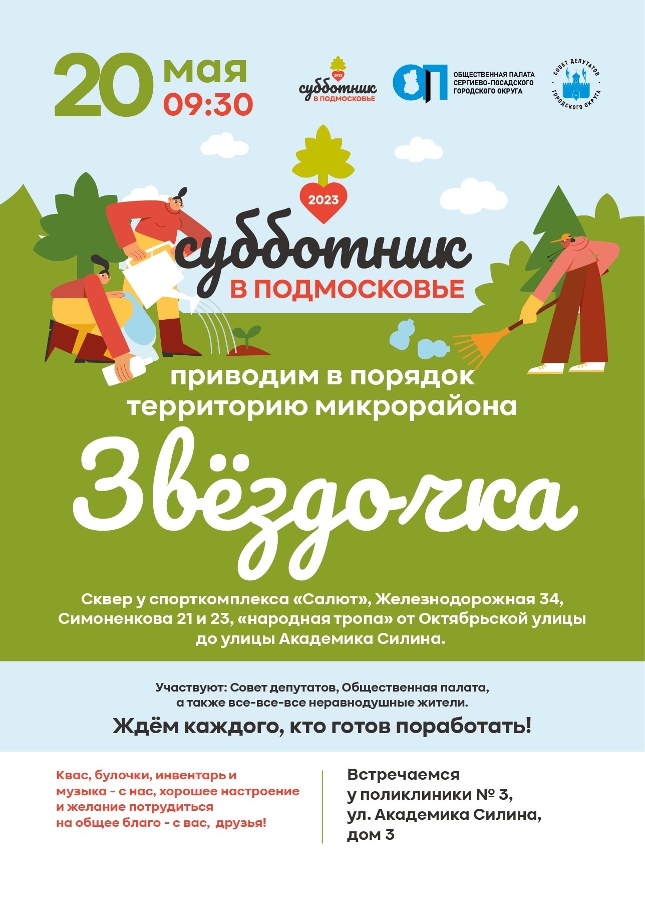Квас, булочки, музыку и инвентарь предоставят организаторы. С собой берите хорошее настроение и желание потрудиться на общее благо!