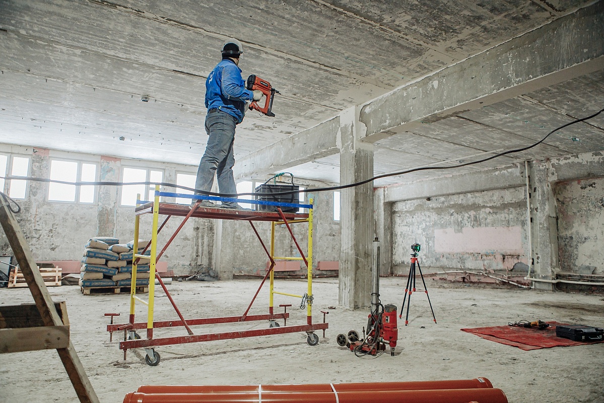Процесс идет ударными темпами, строители уже восстановили все перегородки и приступили к шпатлеванию стен.