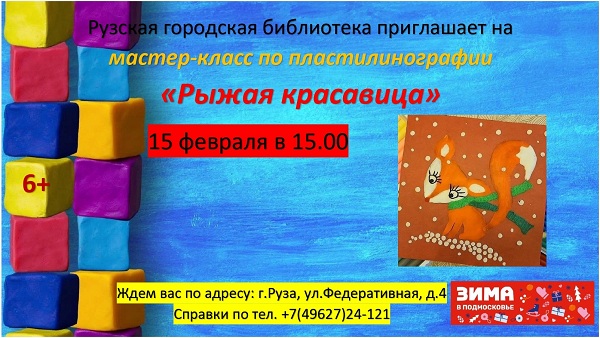 15 февраля в 15 часов в арт-лаборатории «Пластилиновые фантазии» Рузской городской библиотеки пройдет мастер-класс «Рыжая красавица».