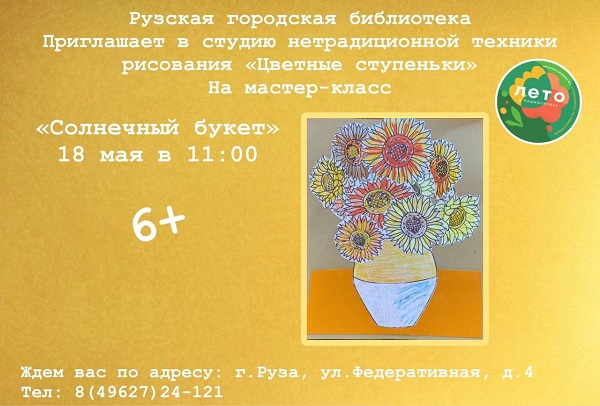 Мастер-класс «Солнечный букет» состоится 18 мая в 11 часов в студии нетрадиционной техники рисования «Цветные ступеньки» Рузской городской библиотеки.