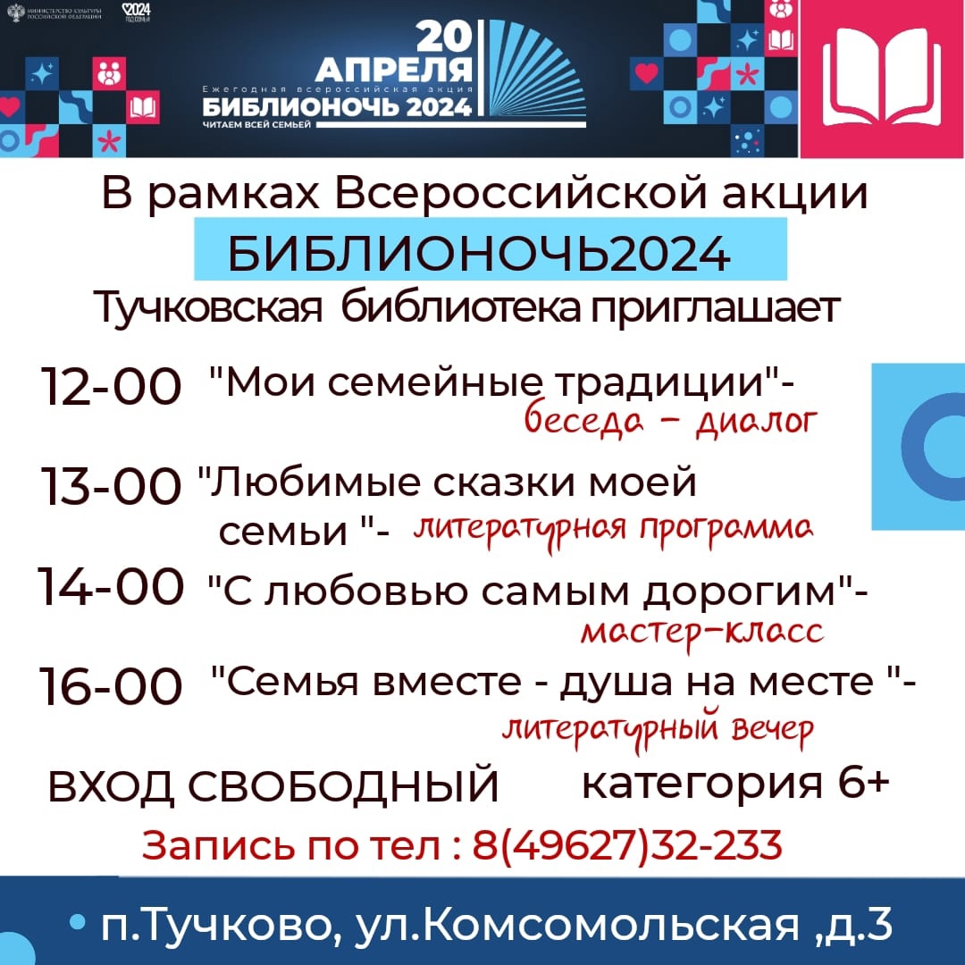 Библионочь будет посвящена Году семьи. Тучковцев ждут беседа о семейных традициях, литературная программа, мастер-класс и литературный вечер «Семья вместе – душа на месте». Приходите – будет интересно!