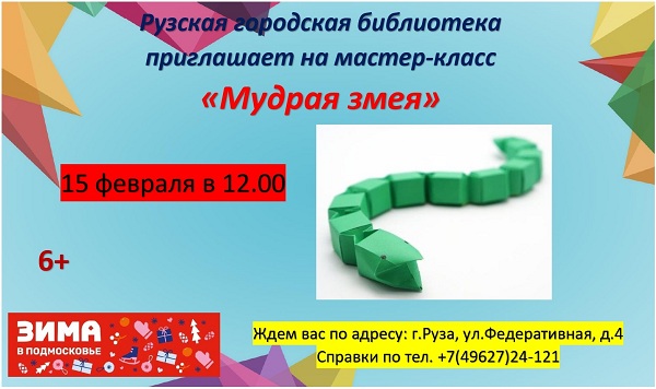 15 февраля в Рузской городской библиотеке состоится мастер-класс «Мудрая змея» в рамках библиомикса «Волшебный квадратик». Начало в 12 часов.