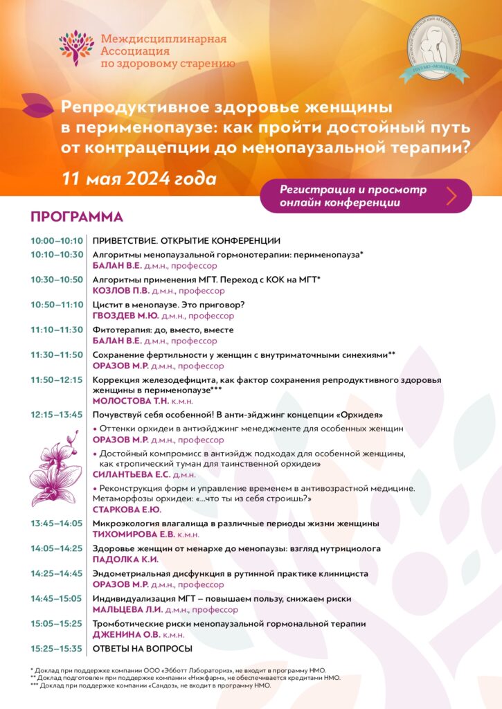 Онлайн-конференция «Репродуктивное здоровье женщины в перименопаузе: как пройти достойный путь от контрацепции до менопаузальной терапии?» пройдет в субботу 11 мая 2024 года.